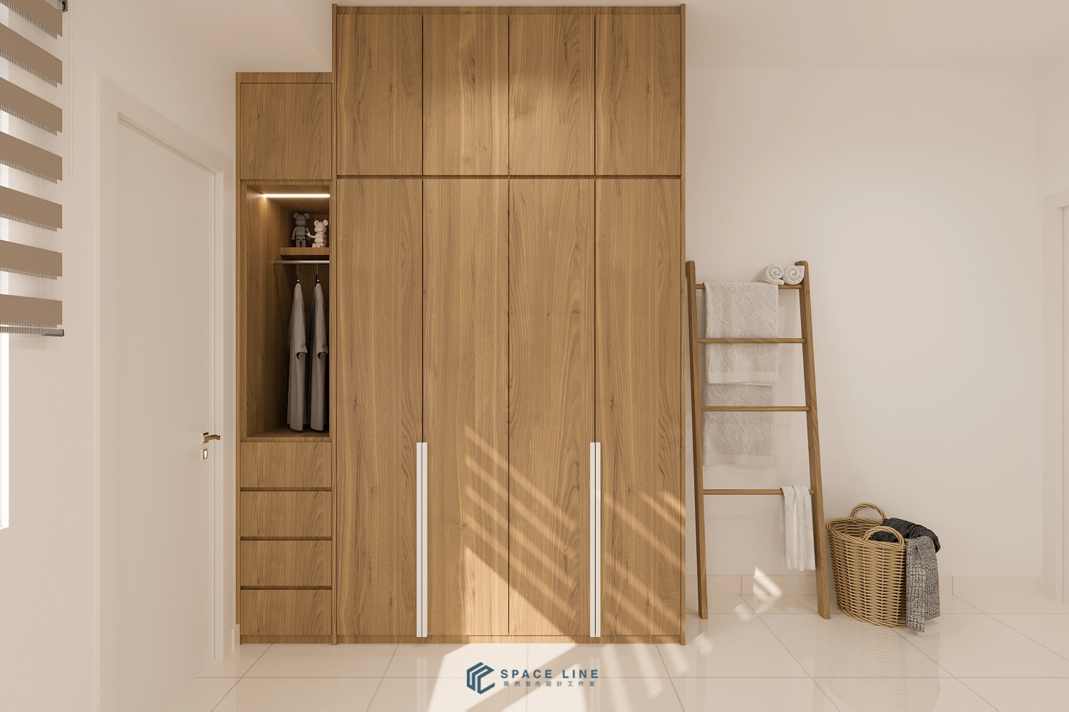 In the master bedroom, the focus is on efficient storage with an L-shaped wardrobe covered in a mix of light solid color and wood laminate. The internal compartments are carefully divided to provide ample, suitable storage for daily use.