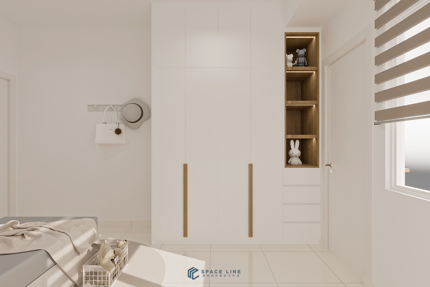 The General Bedroom (Bedroom 2) maintains the main Muji concept with a minimal white wardrobe. The combination of a white, sleek, clean laminate with a wood handle brings out a visual of comfort and organization. Open storage areas are illuminated with warm LED backlighting to subtly highlight decorative items.
