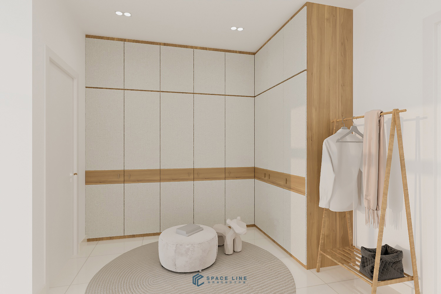 In the family hall, a similar wardrobe design is proposed to provide essential extra storage. Here, a fully wood laminate covering is used for the wardrobe, creating depth and versatility against the white walls.
