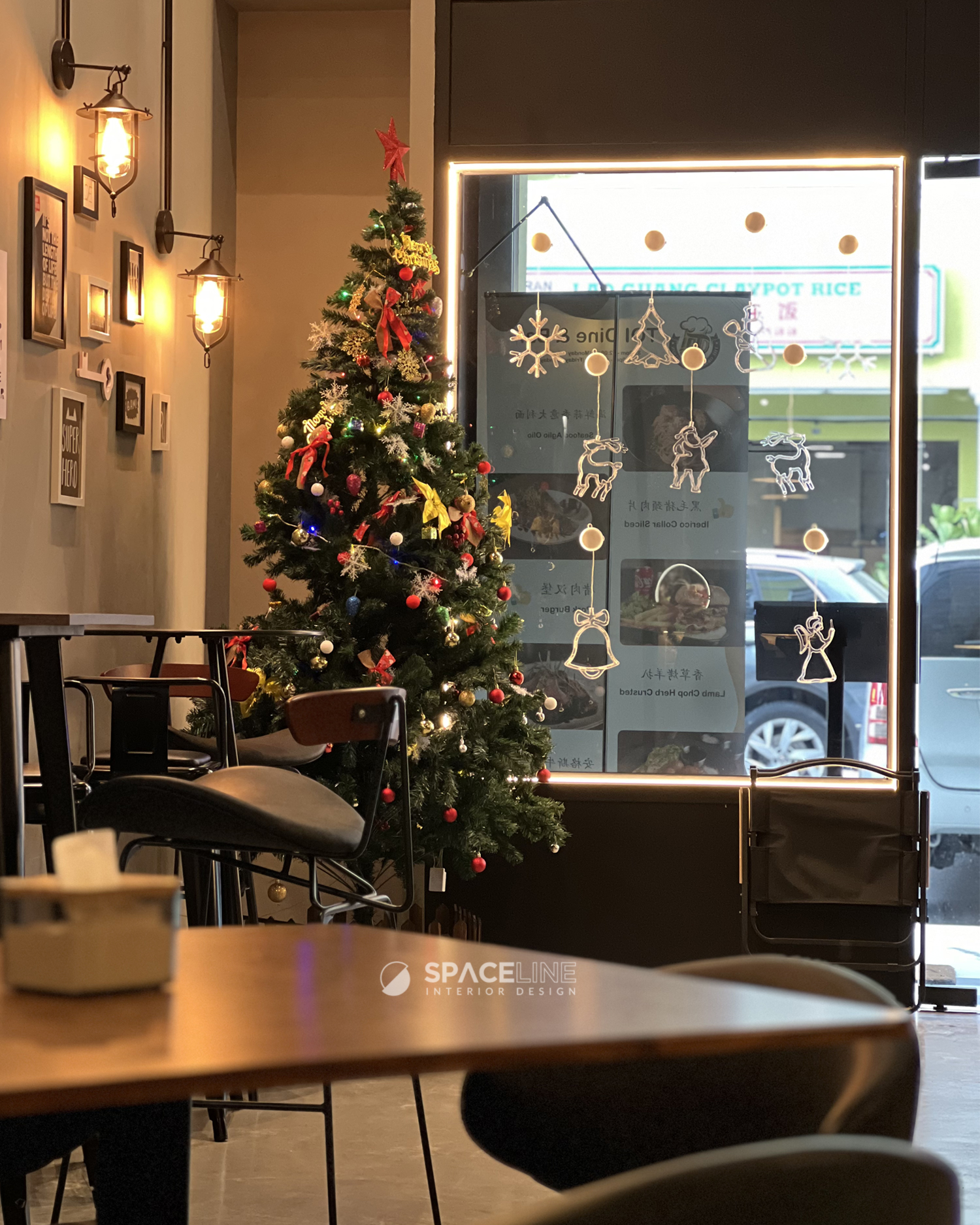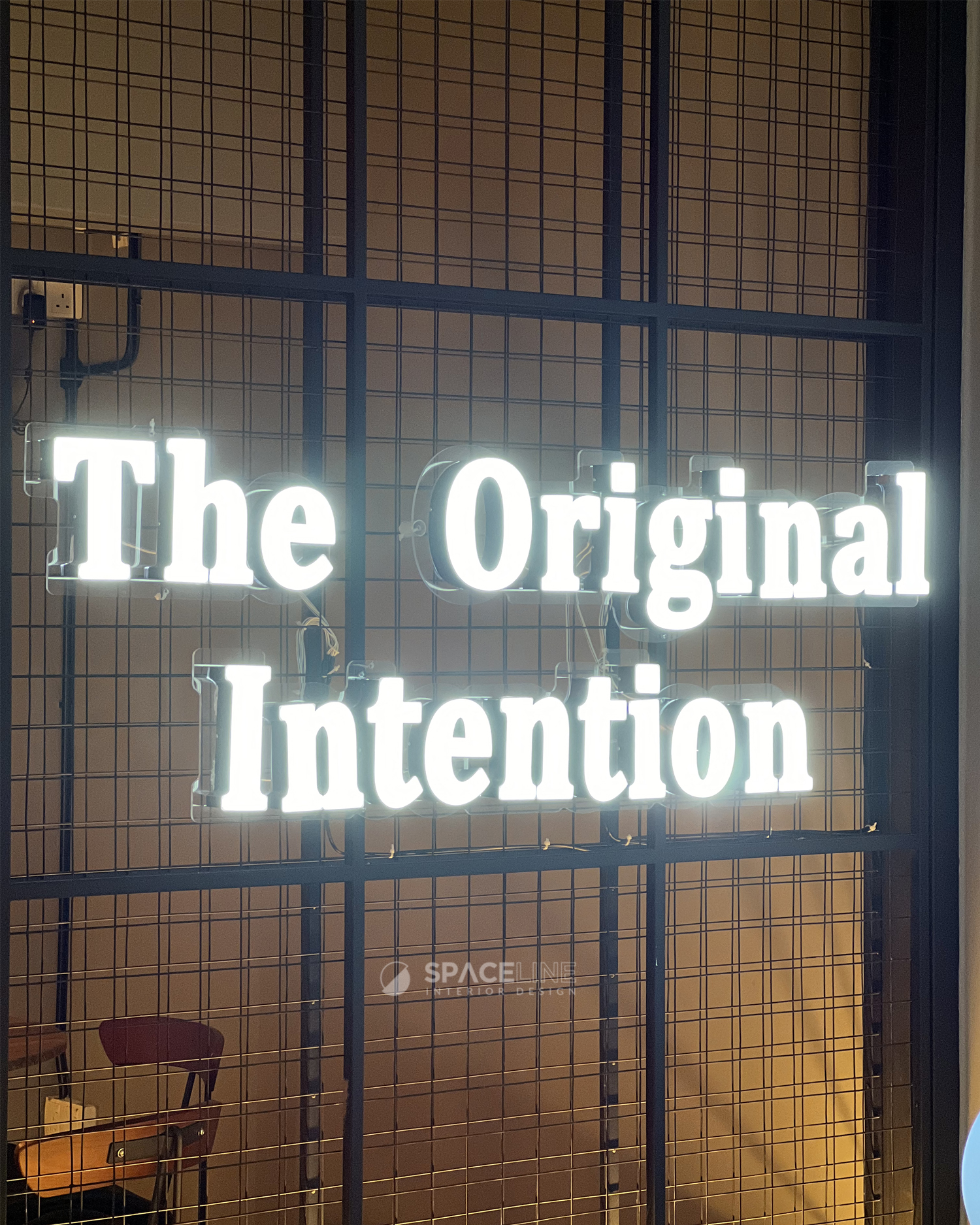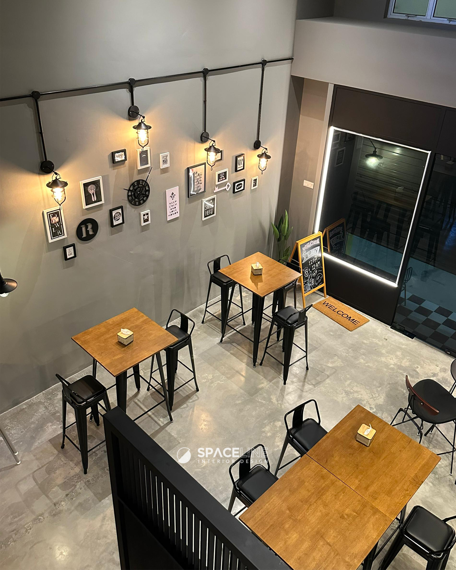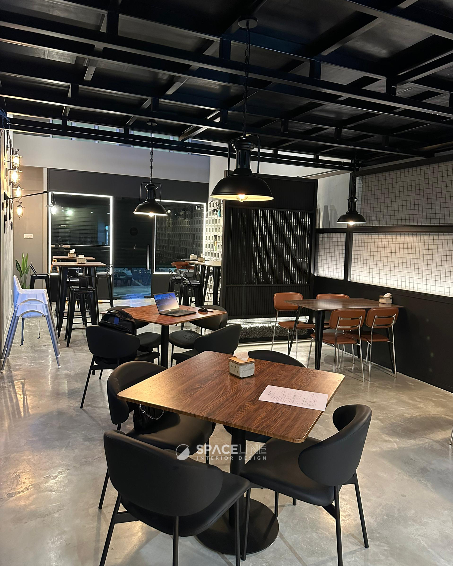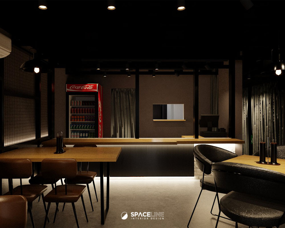 While the existing classical façade remains, the owner’s intention for a distinct premise feeling is achieved through subtle additions. Black tone becomes the main concept color, lending a modern and sleek industrial setting. A lit brand logo acts as the focal point. The entrance is grounded by checkered black and white tiles, which serve as a classical transition and a solid entrance statement, effectively bridging the existing classical exterior feature with the new interior concept.