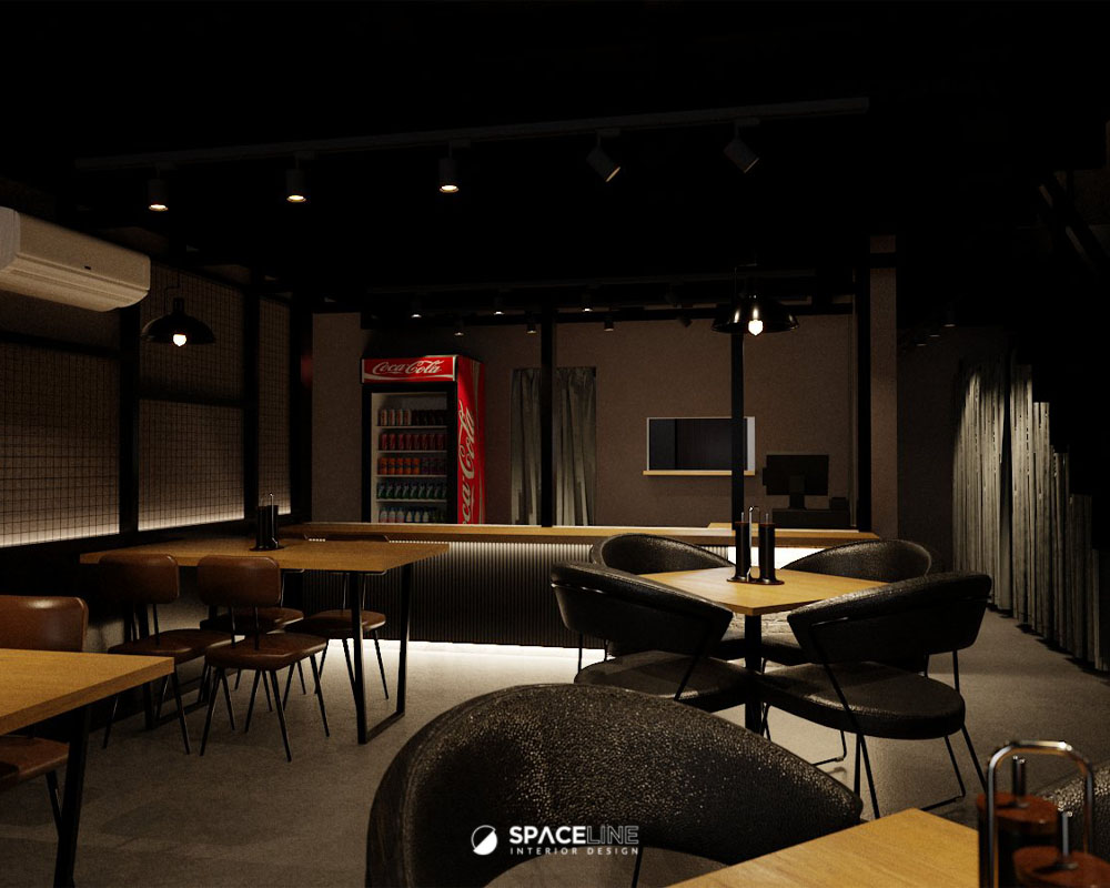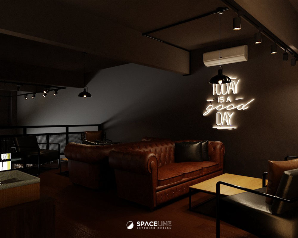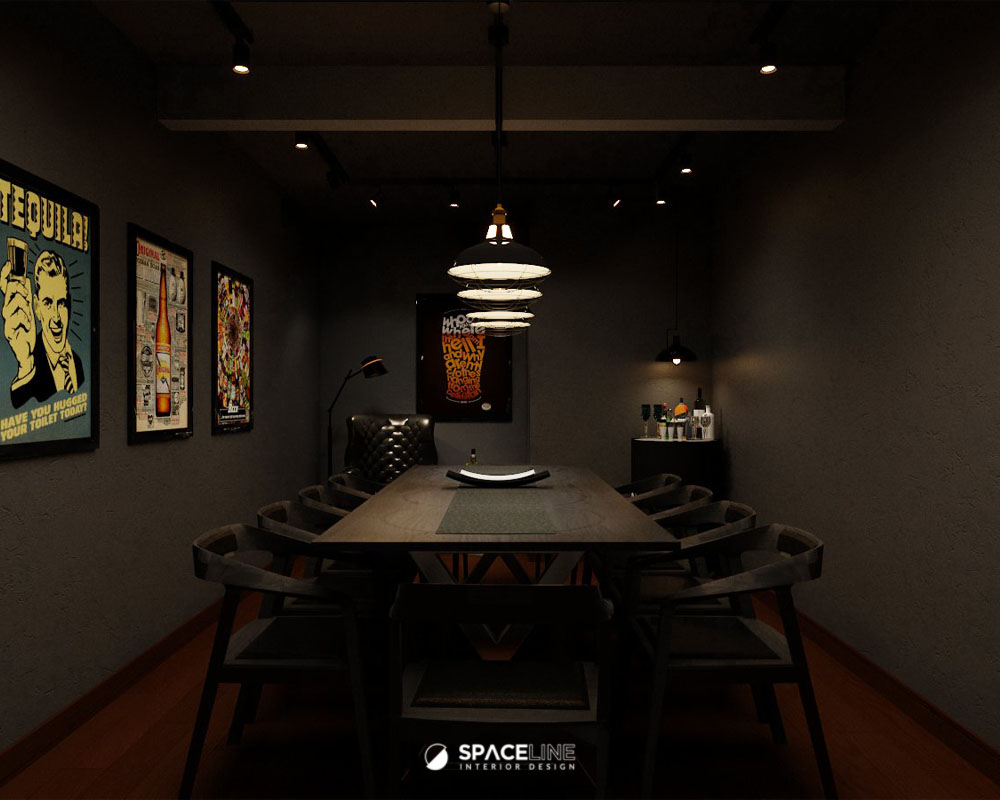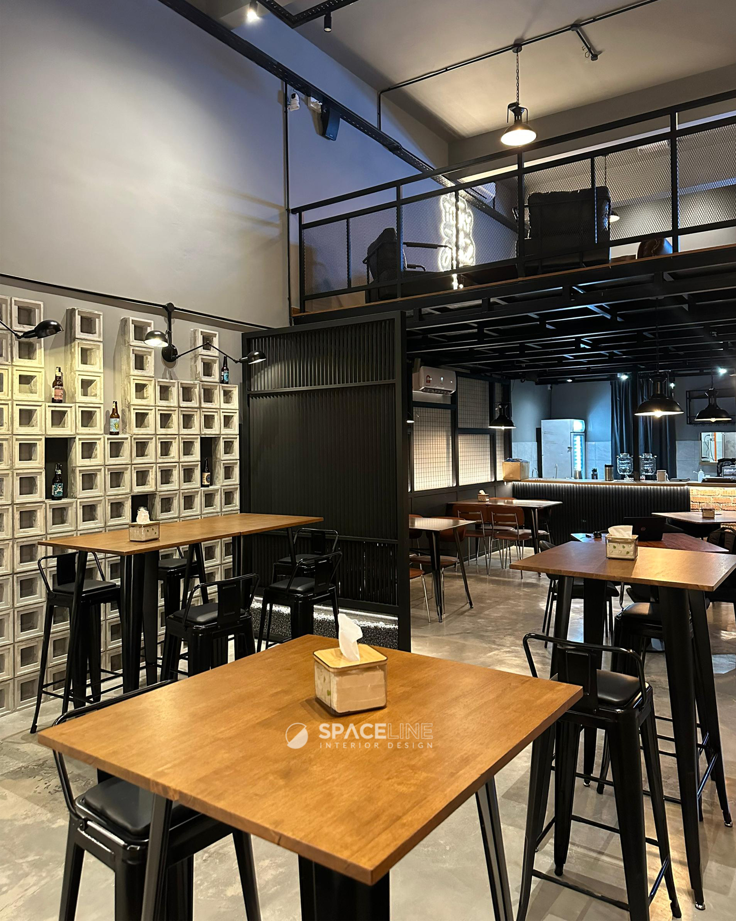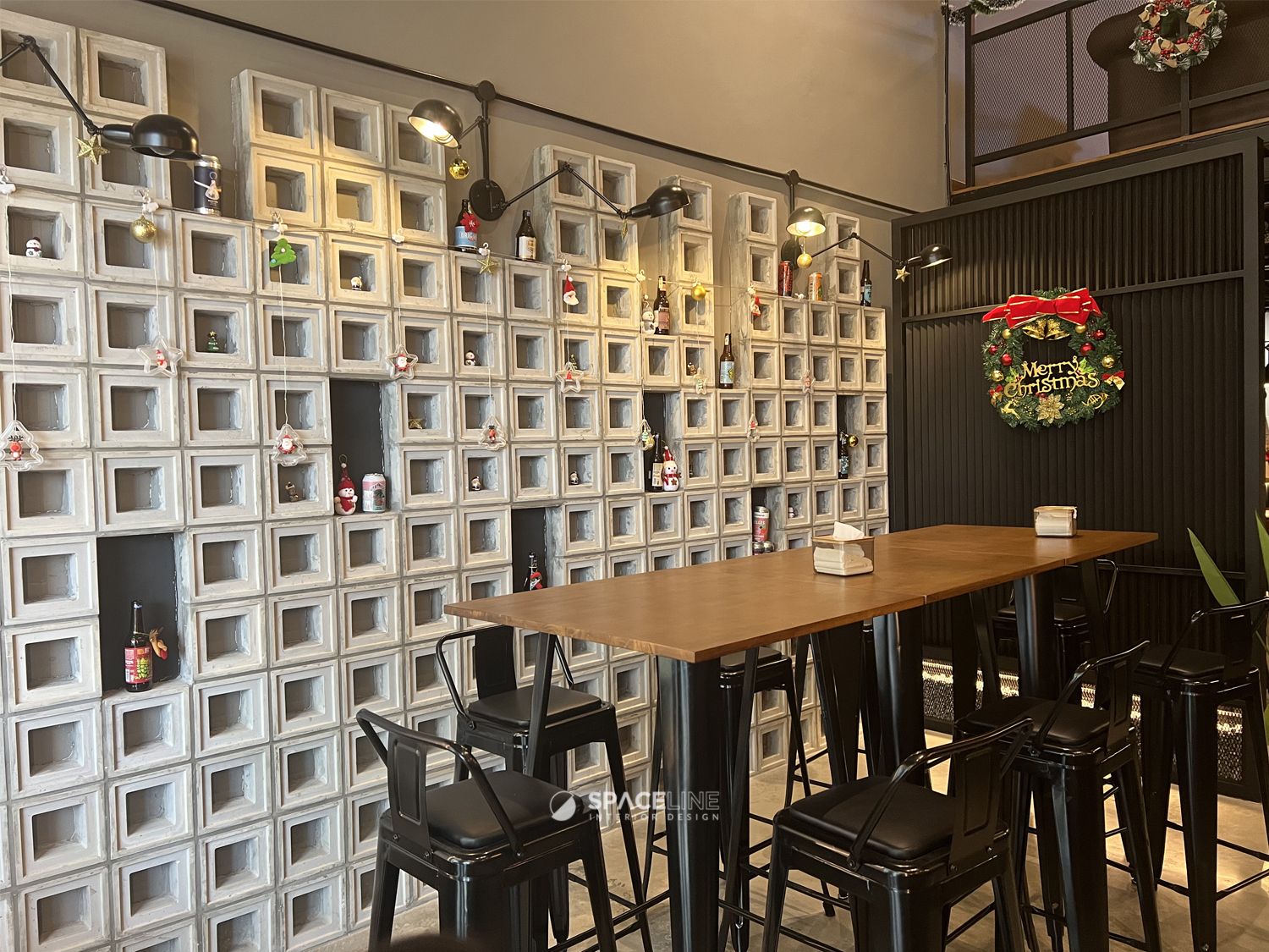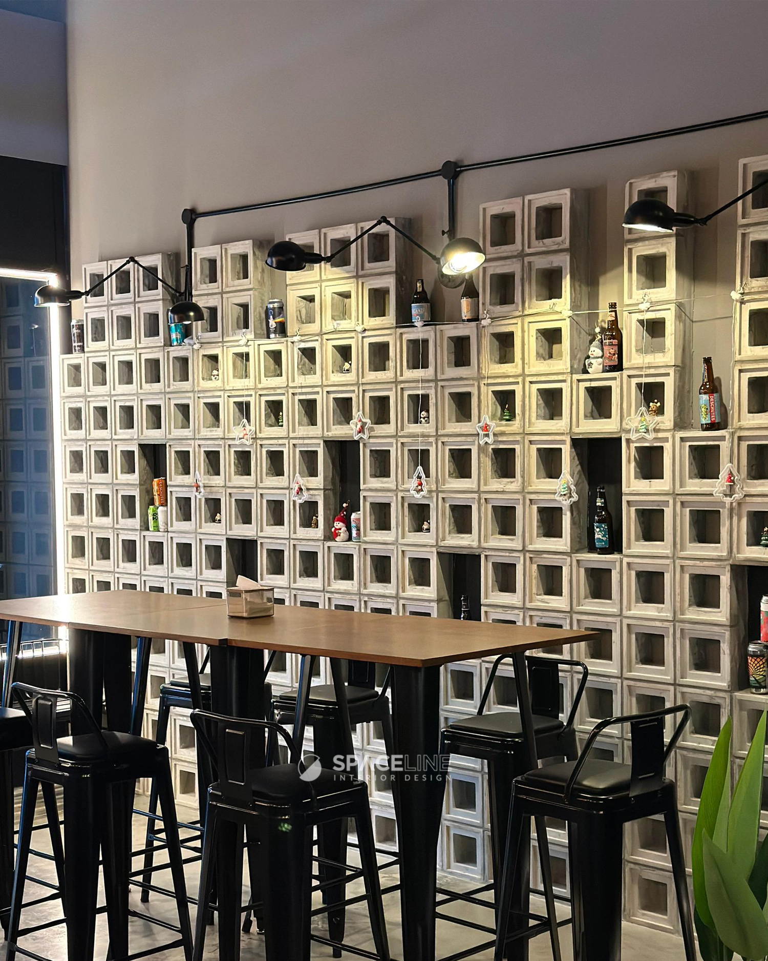 The industrial atmosphere is enhanced by the selection of black light fittings, which evenly illuminate the entire premise. A concrete block feature wall improves the visual sense for social gathering and establishes the premise’s raw, industrial personality. The material palette—grey concrete, black metal, and warm wood tones—evokes a grounded and flexible style. Wall-mounted black spotlights cast gentle shadows on the concrete surface, adding depth and sophistication.