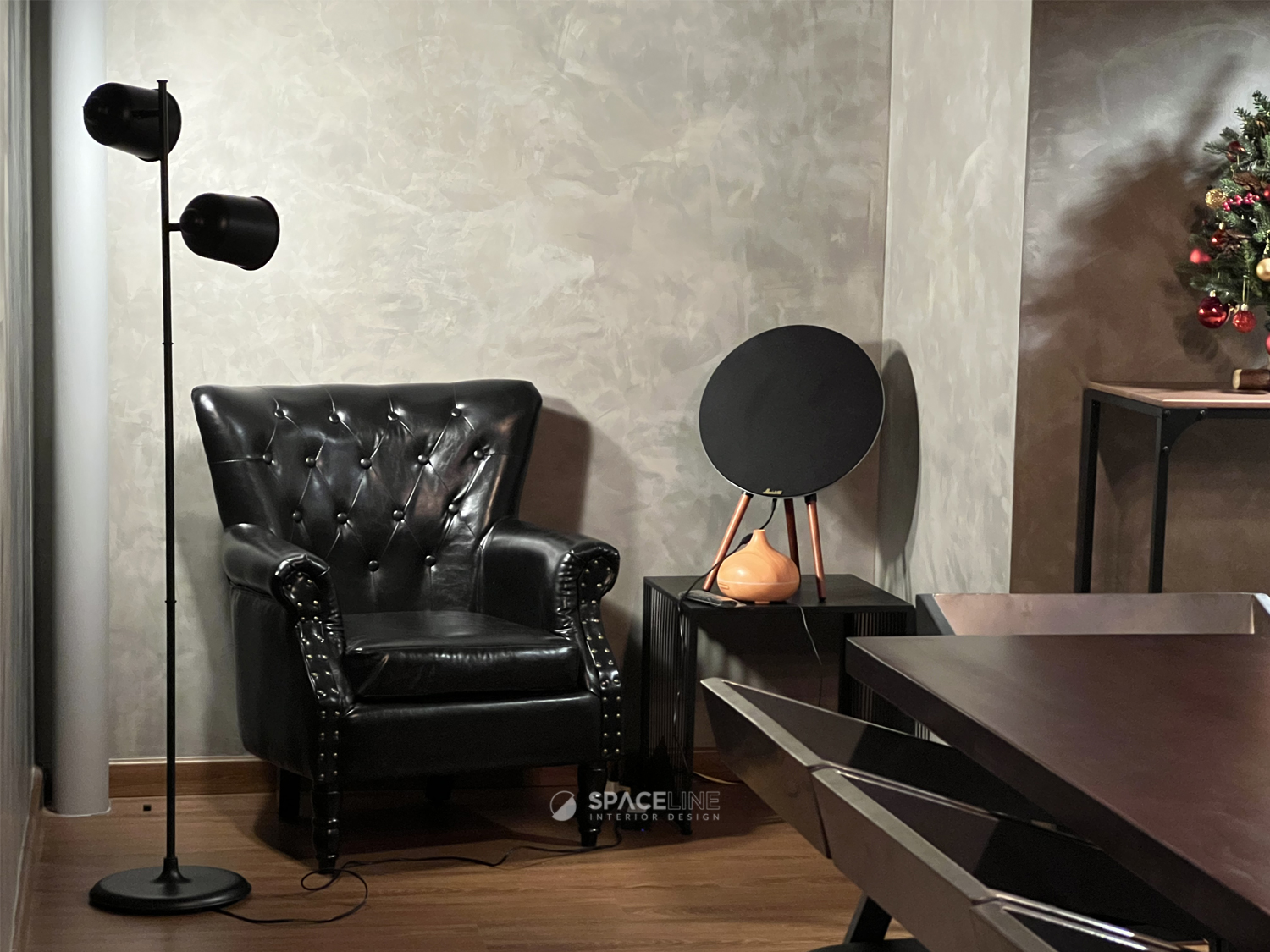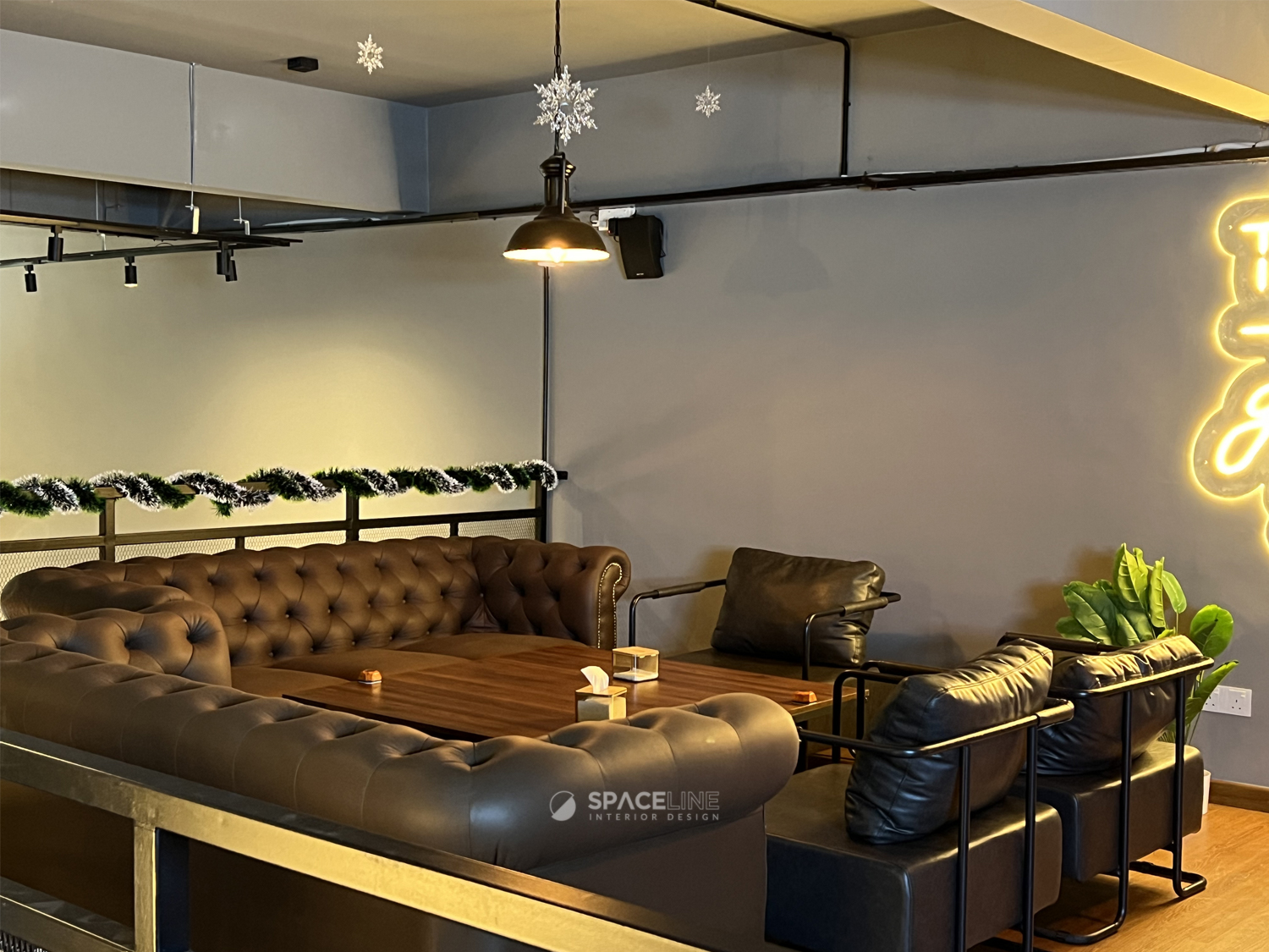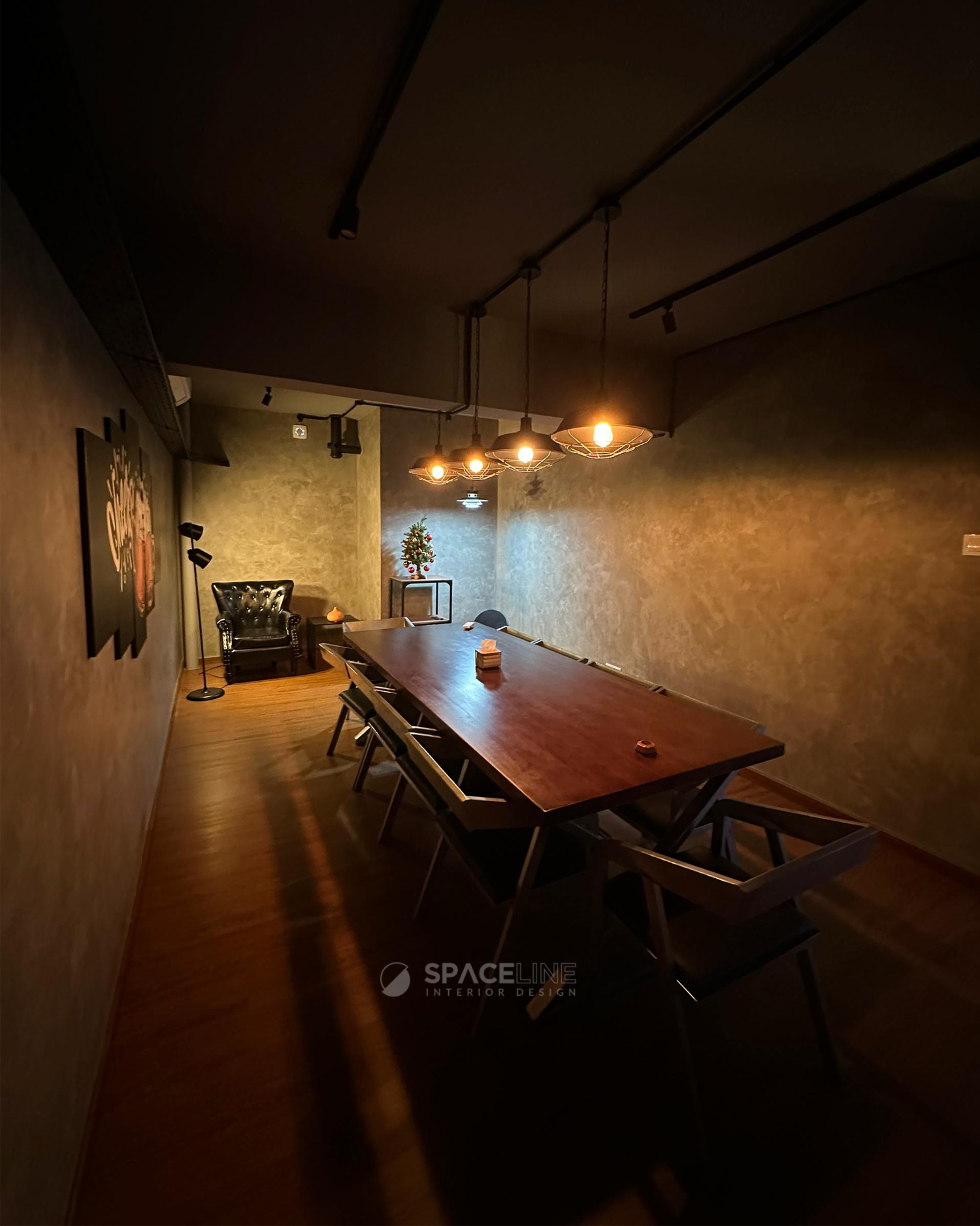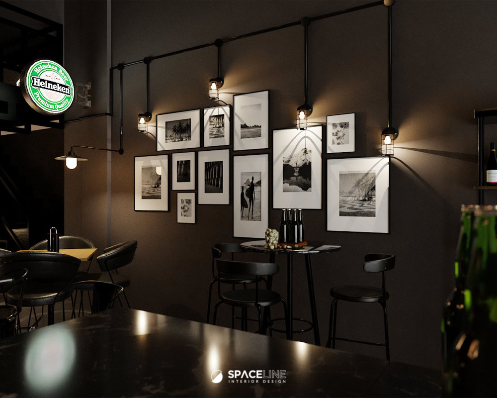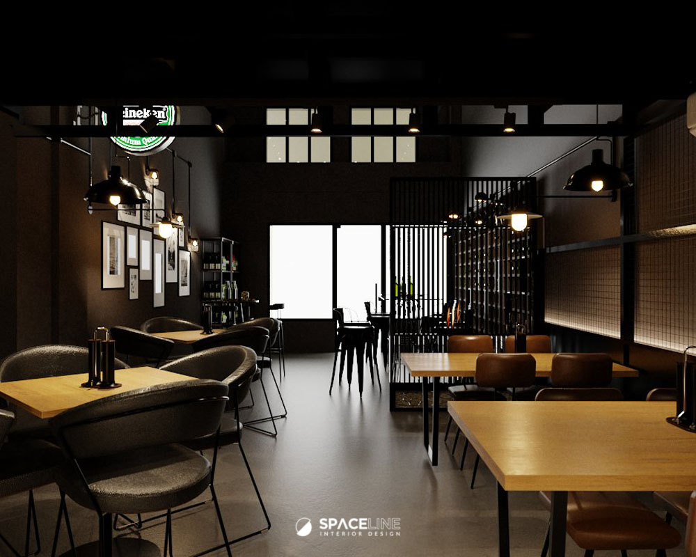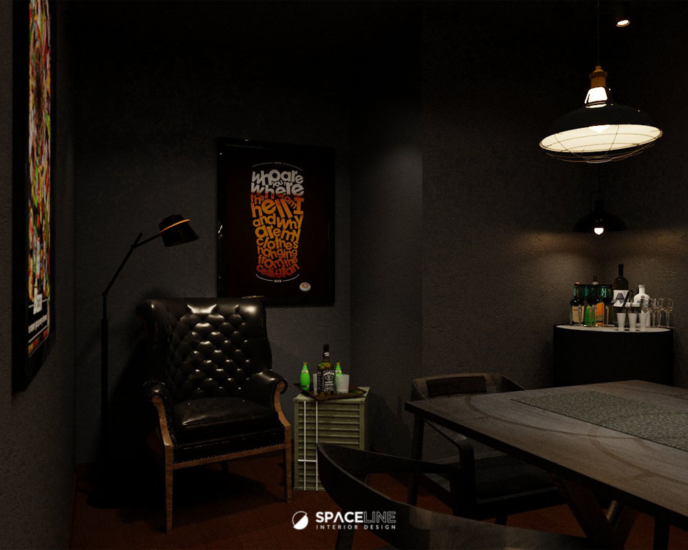 The industrial atmosphere is enhanced by the selection of black light fittings, which evenly illuminate the entire premise. A concrete block feature wall improves the visual sense for social gathering and establishes the premise’s raw, industrial personality. The material palette—grey concrete, black metal, and warm wood tones—evokes a grounded and flexible style. Wall-mounted black spotlights cast gentle shadows on the concrete surface, adding depth and sophistication.