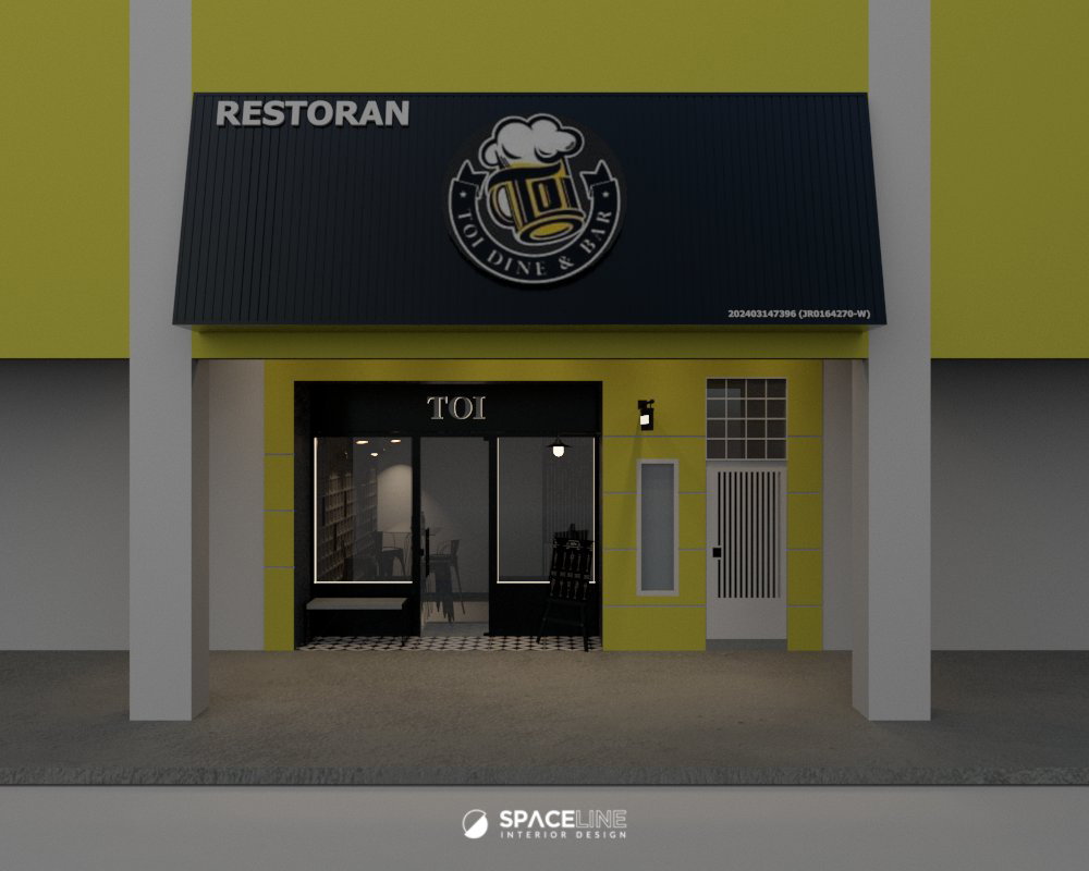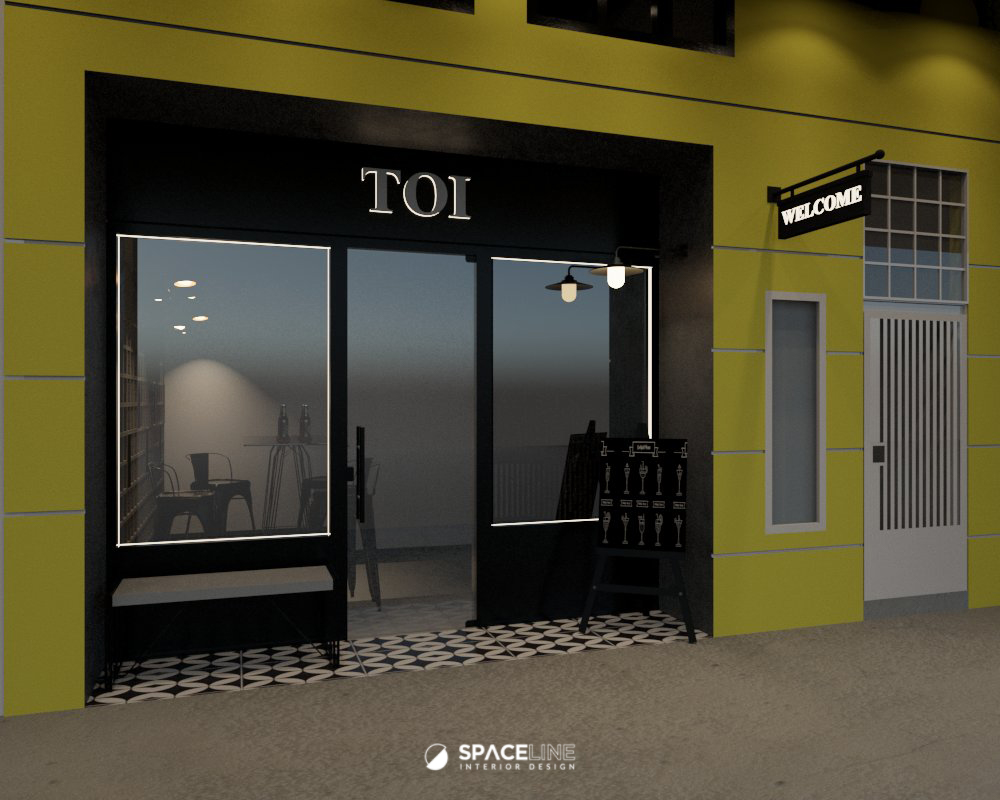 This commercial design project for Toi Dine focuses on an aesthetic transformation, applying a modern, sleek industrial concept within a building characterized by its classic yellow and detailed façade. The design uses a dominant black scheme and raw textures to create a grounded, sophisticated, and highly functional dining experience across two levels.