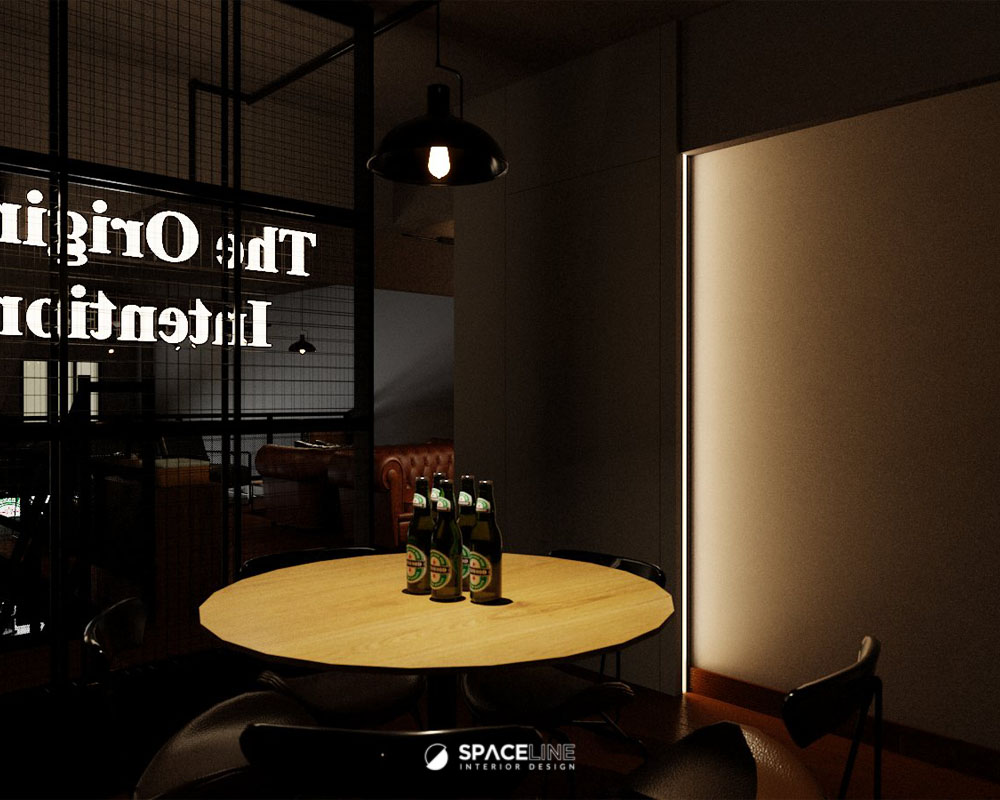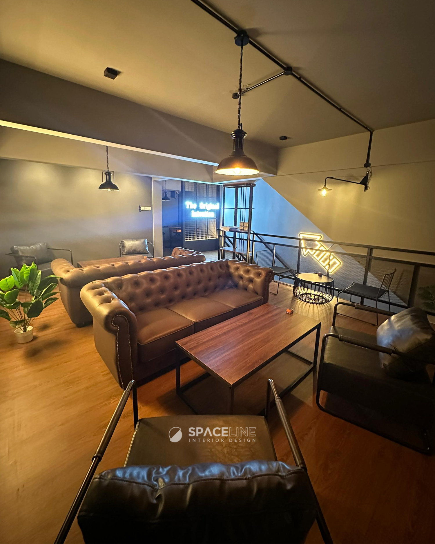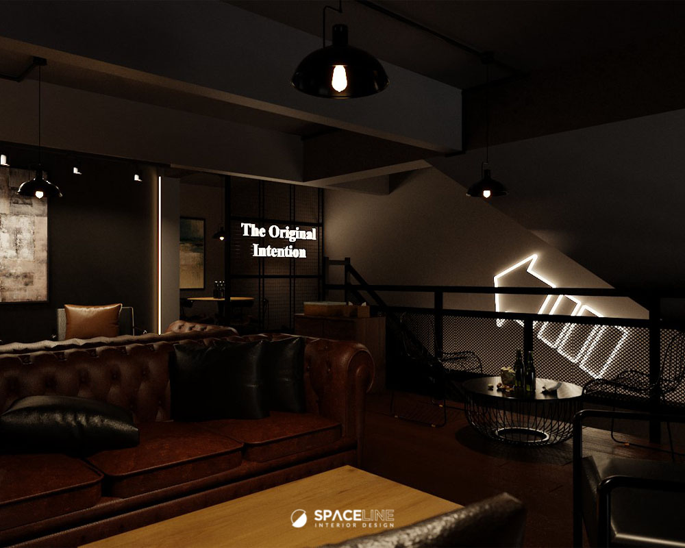 The first-floor mezzanine fulfills the need for both open and private dining areas. These spaces are separated by a hidden door partition and a mesh wire feature wall opposite the stairs. This mezzanine is ideal for large customer numbers, often serving as a spot for celebrations and private ceremonies. Classic Chesterfield style sofas in rich brown and black leather enhance a vintage classic vibe, adding boldness to the industrial setting. The private dining space can serve 10 pax with a large surface dining table and focused warm-tone light, creating a lounge-like feeling.